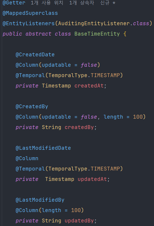 - JPA Entity 클래스들이 해당 추상 클래스를 상속할 경우 createdAt, modifiedAt 처럼 추상 클래스에 선언한 멤버변수를 컬럼으로 인식할 수 있다.