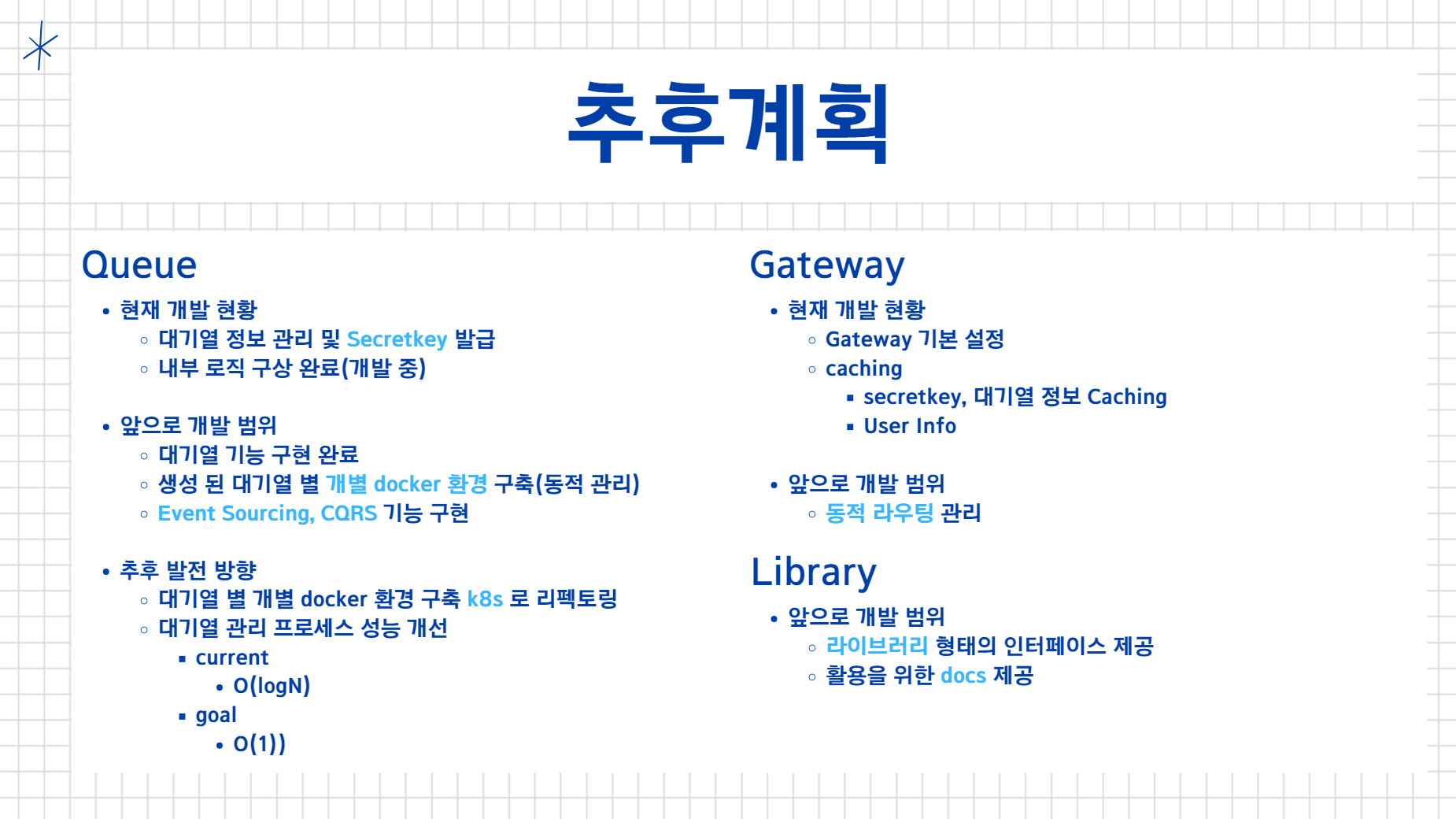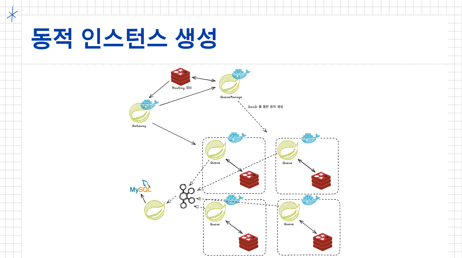 대기열 생성 요청이 들어오면 큐 관리서버에서 Docker out of Docker 방식으로 대기열을 처리하는 서버를 동적으로 띄워주고, 해당 메타정보를 Redis에 저장해 Gateway에서 동적 라우팅이 가능하게 할 것이며, 기존 Event Sourcing 방법을 재활용해서 큐 서버로부터 받아온 이벤트들로 백업본을 저장하는 용도로 사용할 예정이다. 이 방법 또한 큐 관리 서버의 자원을 소모해서 인스턴스를 띄워주기에 완벽하진 않다. 쿠버네티스 같은 컨테이너 오케스트레이션 도구를 통해 분리가 필요하지만, 짧은 기간상 여기까지 기획하고 개발에 들어갔다.