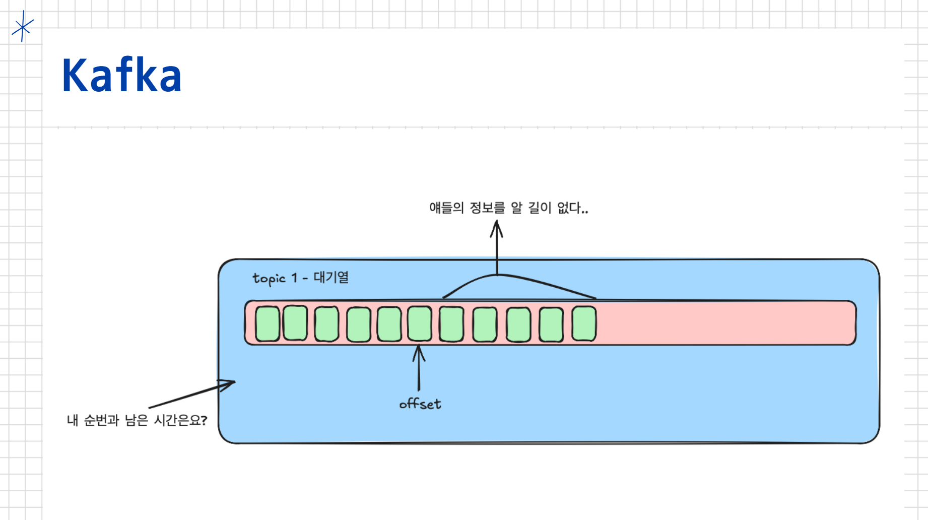 앞에서의 대기열을 Kafka로 선택했다. 각 사용자별로 토픽을 생성하고, 파티션을 하나로 가져가면서 순서를 보장하려는 계획을 세웠었는데 사용자로부터 특정 사용자의 순번과 남은 시간을 요청했을 때, 파티션의 offset 뒤에 있는 정보들을 가져와 처리할 수 없다는 문제가 있었다.
