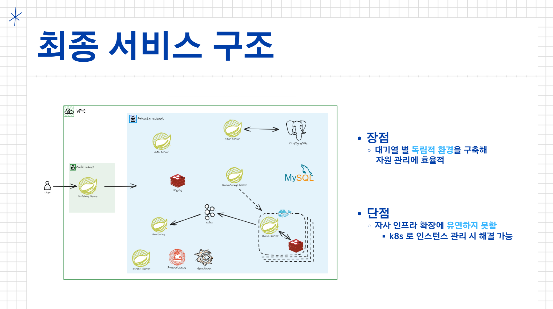 AWS처럼 종량제 과금방식으로 사용하기 쉬운 SaaS 서비스를 제공하는 것을 생각했고, 대신 높은 트래픽을 대신 처리해주는 대기열 서비스를 선택해 개발 난이도를 높였다. 그에 따라오는 장점으로 B2C 개발 대비 CRUD 작업이 줄어들어 핵심 로직 구현에 집중할 수 있었고, 대용량 트래픽에 대응되는 아키텍처를 구상해보면서 시야를 넓힐 수 있었다.