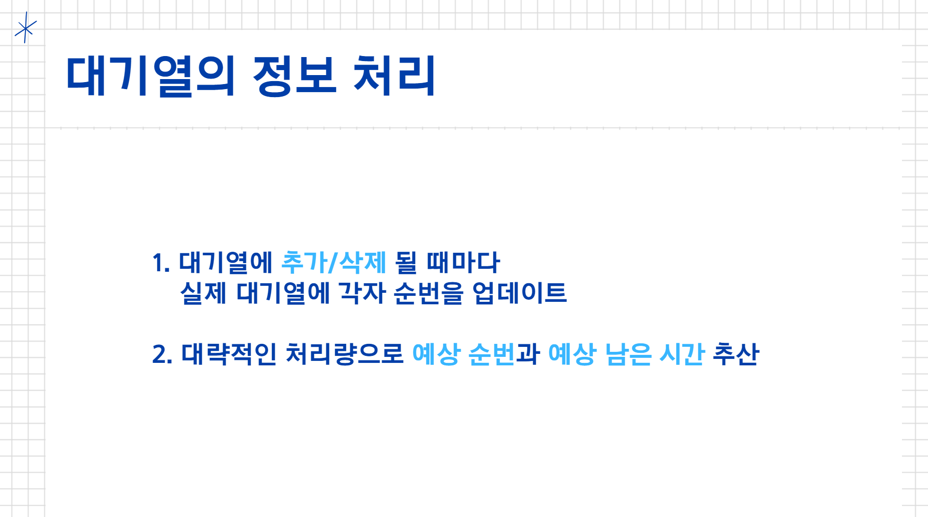 그에 따른 2가지 방법 중 첫번째는 대기열에 변경이 있을 때마다 실제로 업데이트해서 정합성을 제공하는 것이고, 두번째는 대략적인 처리량으로 예상 순번과 예상 남은 시간을 추산하는 것이다. 우리팀은 먼저 첫번째 방식으로 구현하고, 추후 쌓인 데이터를 기반으로 두번째 방식으로 마이그레이션하자는 결정을 내렸다.