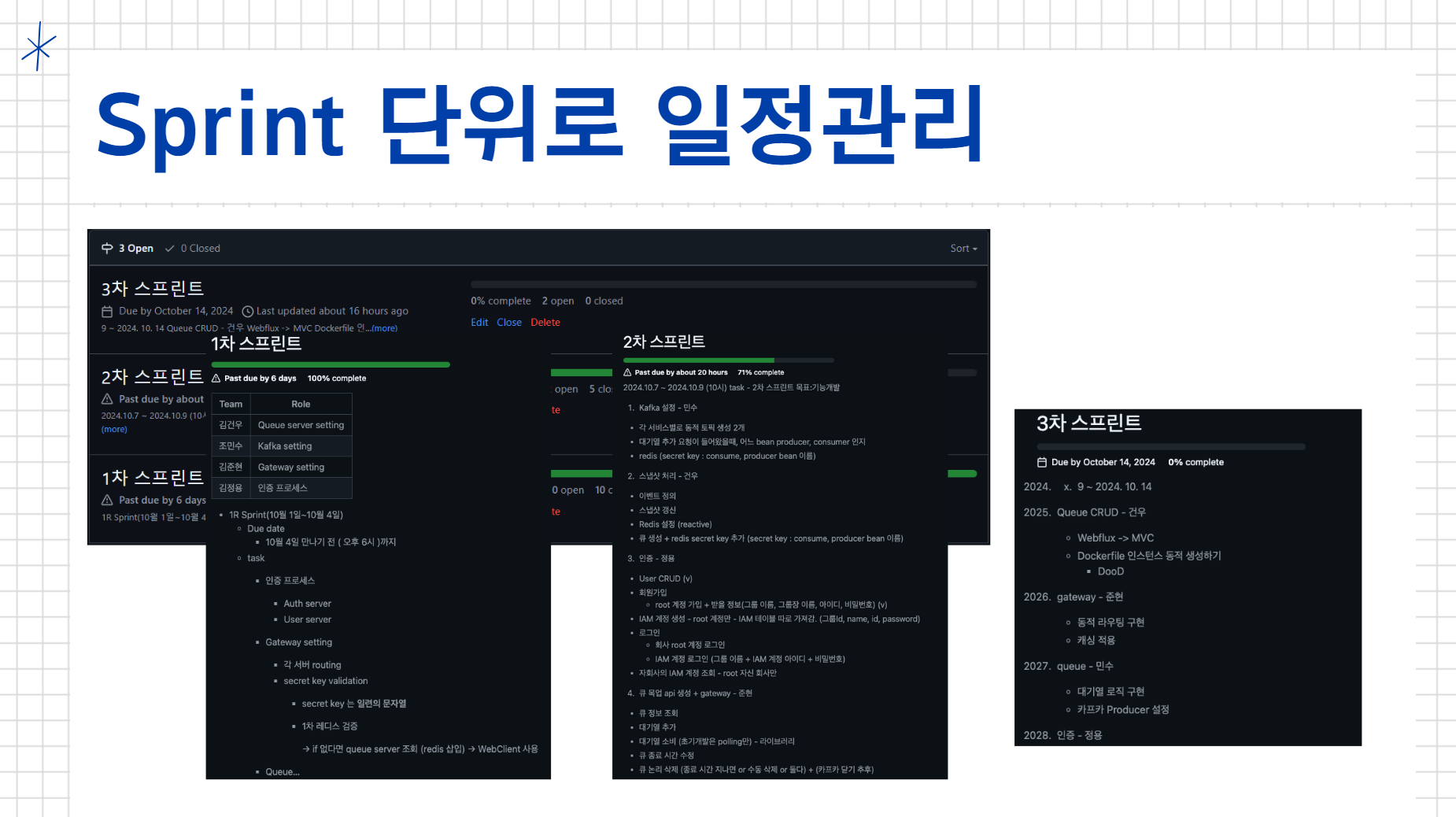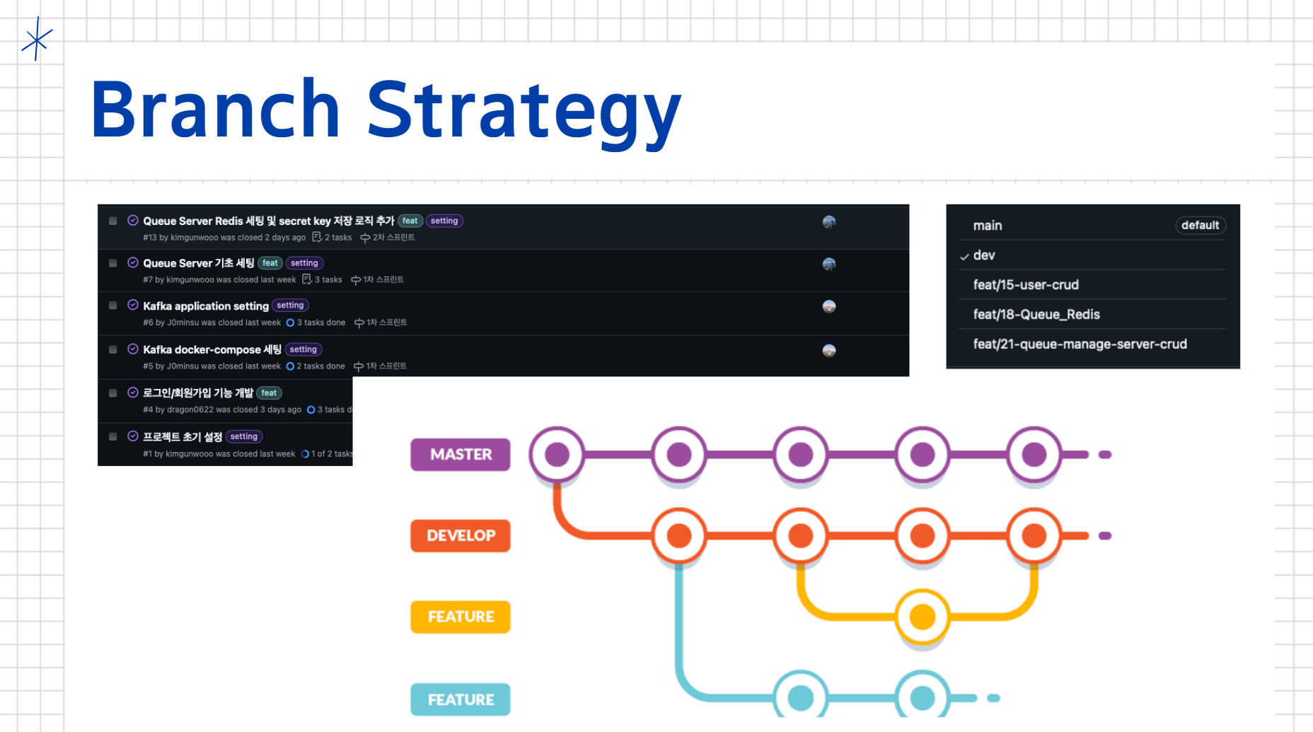 브랜치 전략으로는 main-dev-hotfix-feature로 이슈를 발행한 후 해당 브랜치를 파고, PR과 코드리뷰를 통해 이슈와 브랜치를 닫는 전략을 사용했다. 또한 sprint 단위로 일정을 관리했다.
