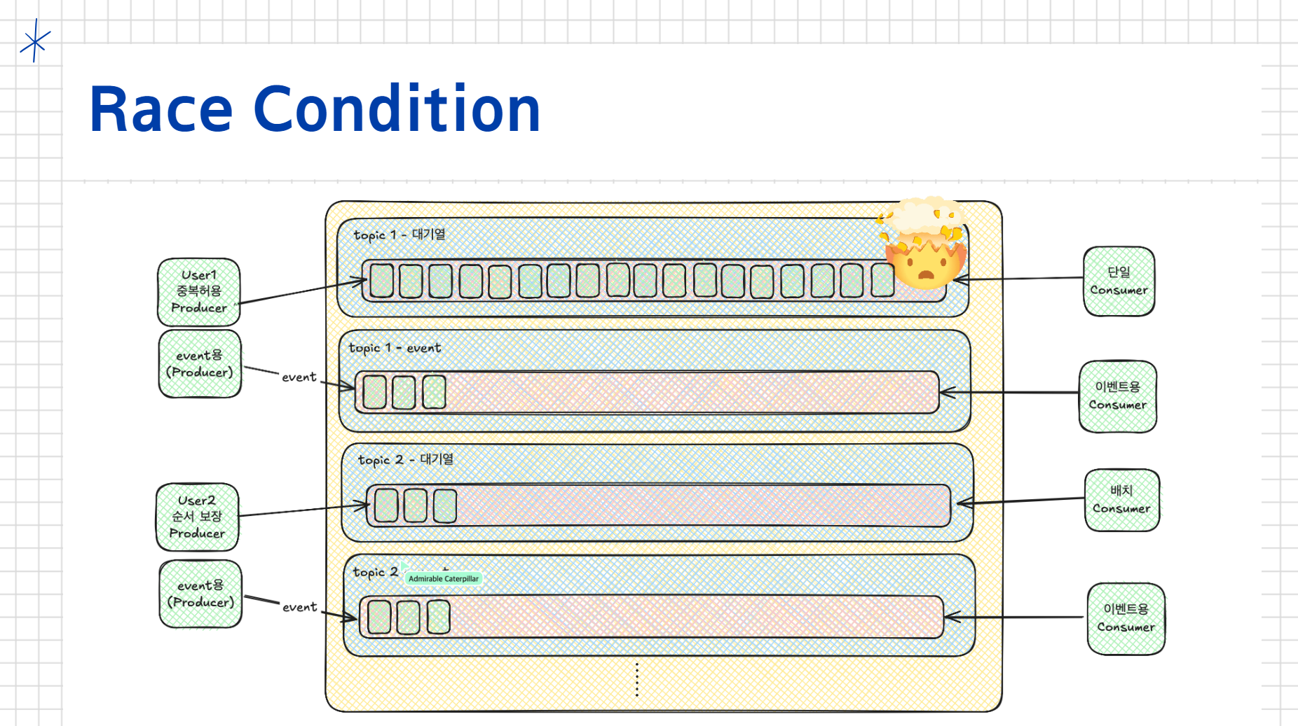 위에서 해결된 줄 알았지만, Race Condition이라는 문제가 남아있었다. 특정 토픽에서만 트래픽이 몰린다고 가정한다면 같은 환경에서 동작하는 다른 사용자들에 대해서도 느려지는 문제가 발생했다. Auto Scaling 을 한다고 하더라도 단 한 사용자에 대한 트래픽 때문에 서버 전체를 늘려야하는 문제가 있었다.