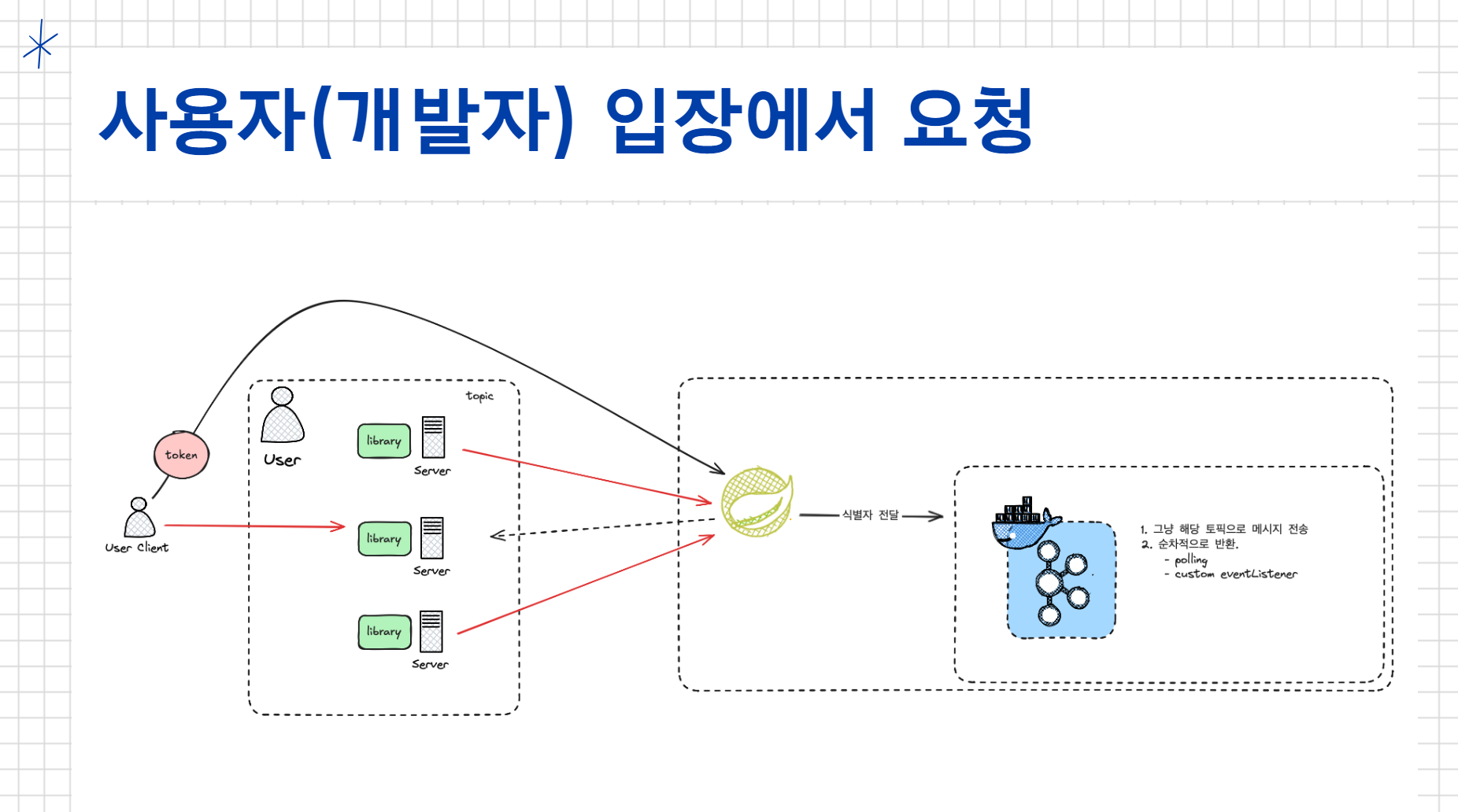 처음에는 B2B2C의 C쪽에서 우리팀이 발급한 token을 통해 사용자 서버를 우회해서 트래픽을 받자는 생각이였지만, 보안적으로 취약했기에 '우리 서비스를 사용하려면 그 정도 트래픽은 감당해라'라는 기획적인 측면으로 해결했다. 그리고 사용자 서버에서는 우리팀이 제공한 라이브러리를 통해 쉽게 통신할 수 있도록 할 예정이다.