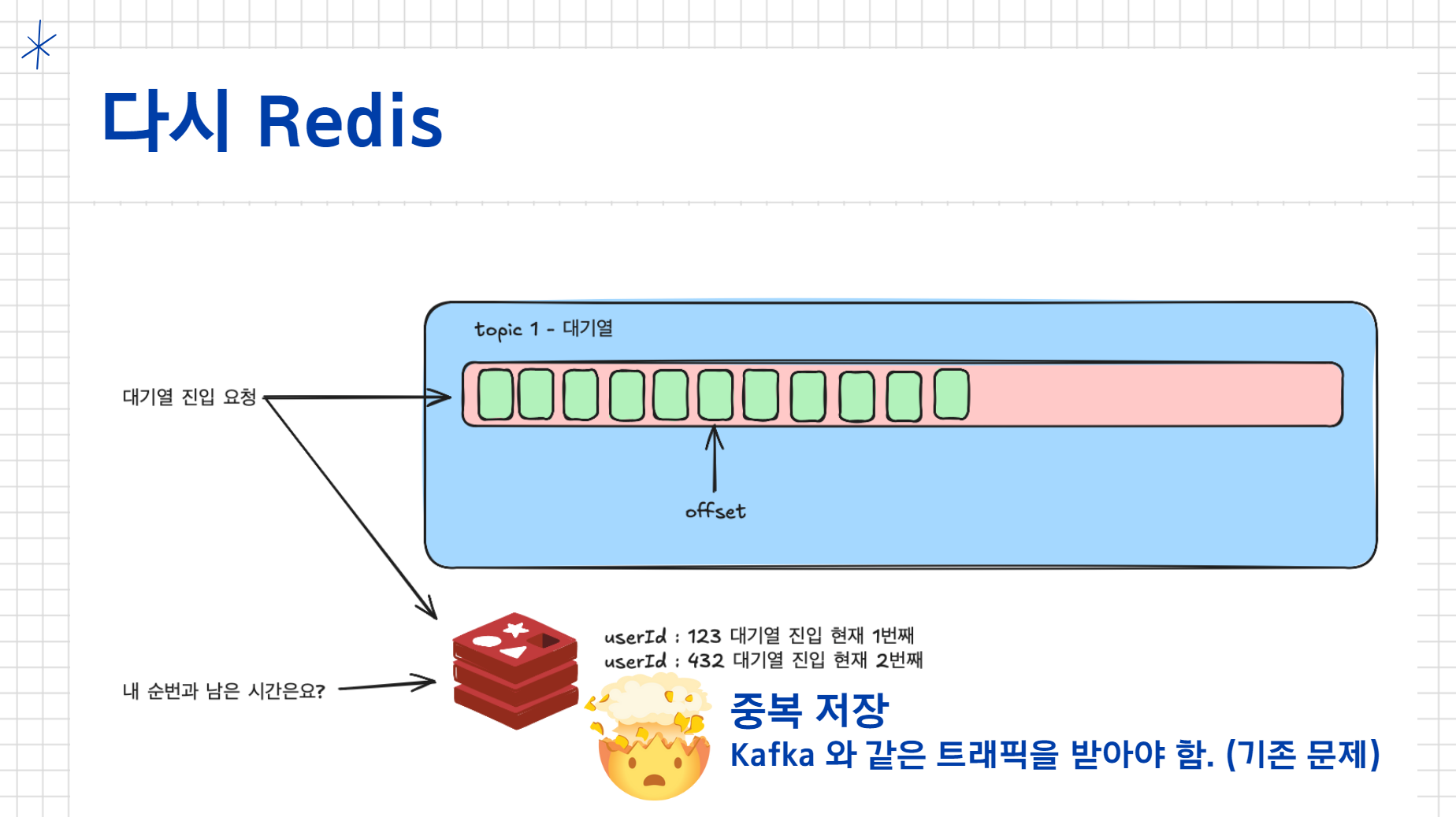 그에 따른 해결책으로 다시 Redis를 도입해 대기열 정보를 저장하려 했지만, 중복 저장 문제와 Kafka와 같은 트래픽을 받아야하는 처음 생각했던 문제로 돌아가게 되었다.