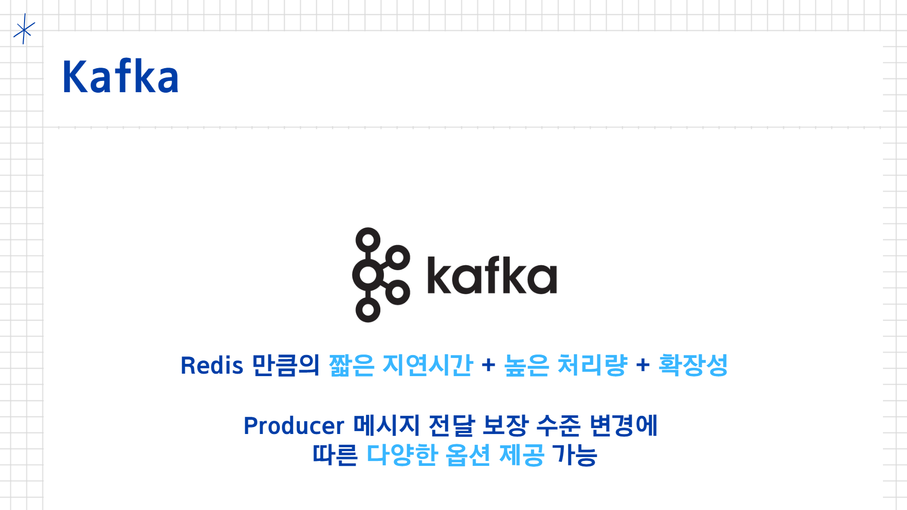 Kafka는 Redis만큼의 짧은 지연시간과 더불어 높은 처리량을 가지고, 확장성 또한 뛰어나다는 장점이 있다. 또한 Kafka Producer의 메시지 전달 보장 옵션을 변경하면서 다양한 옵션을 사용자에게 제공할 수 있다는 장점이 있어서 앞단 대기열을 Kafka로 받자는 선택을 했다.