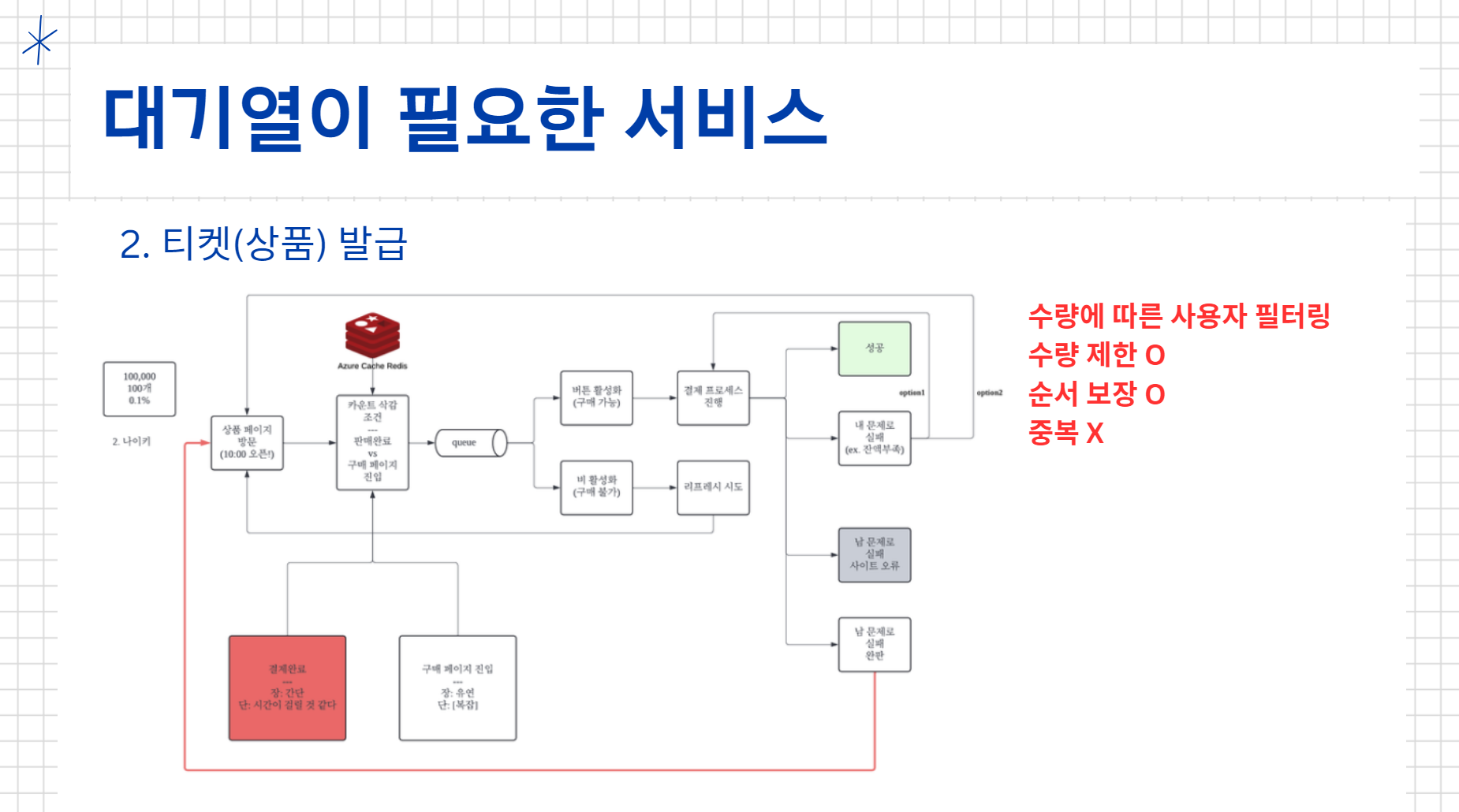다음은 티켓 발급 서비스이다. 한정된 수량이 존재하기에 그 외의 요청에 대해선 필터링이 필요하지만, 기본 대기열이 필요하고, 순서가 보장되어지되 중복이 일어나서는 안 된다. 이 2개의 서비스 간의 공통점을 기본 제공 스펙으로 차이점을 옵션 스펙으로 가져가려 했다.
