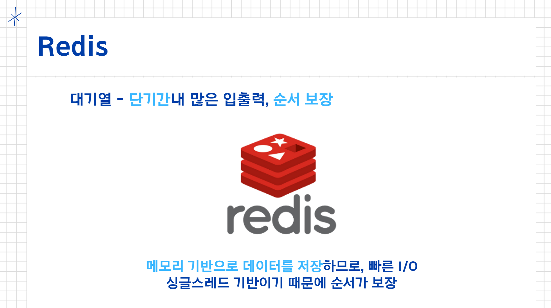 대기열은 매우 짧은 시간 내 많은 입출력이 오가고, 순서가 보장되어야한다. 가장 많이 사용하는 것이 Redis이다.
