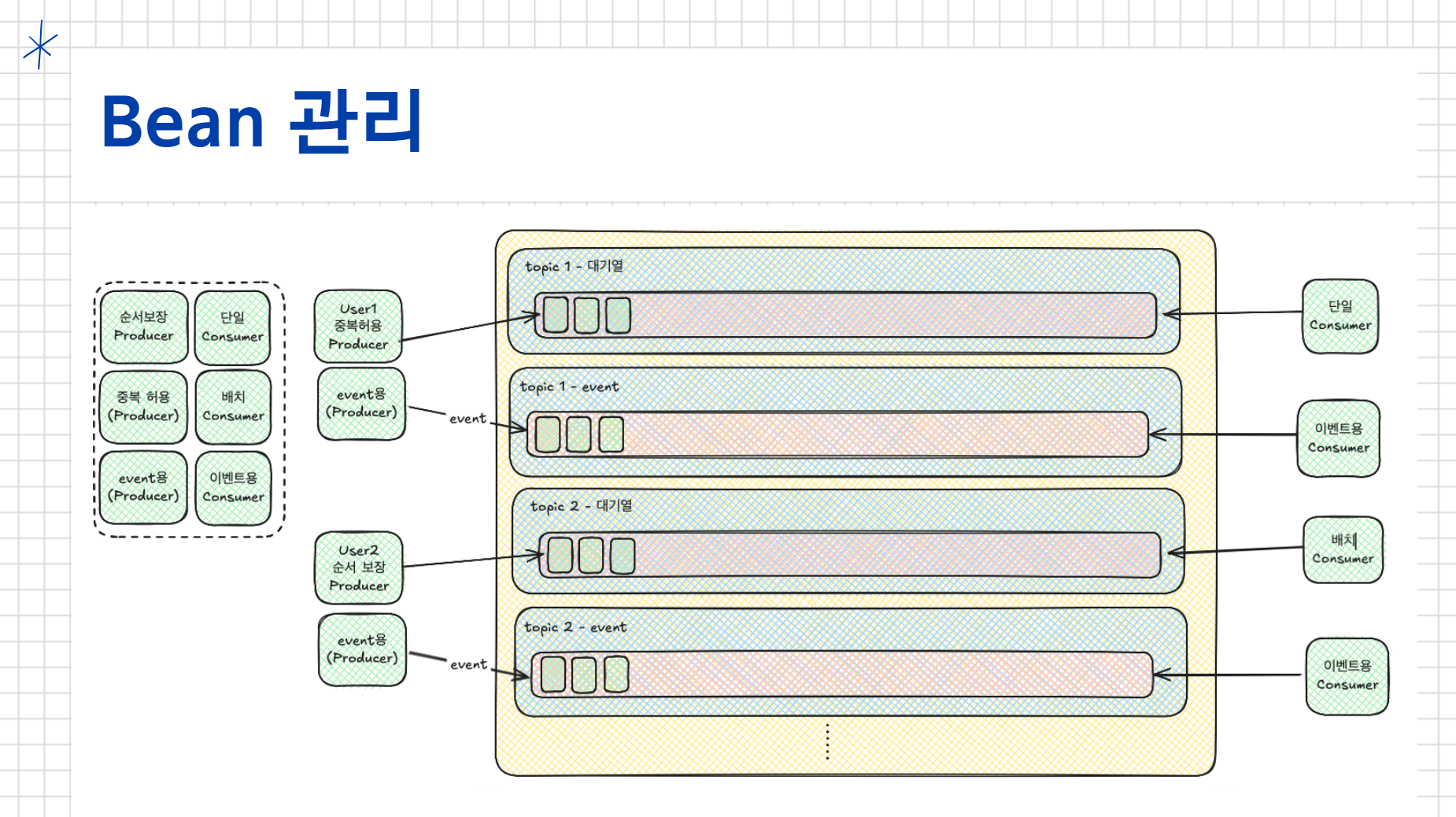 이에 따른 문제가 Bean 관리였다. 사용자별로 하나의 Producer, 2개의 Consumer가 필요하기 때문에 어떤 사용자가 어떤 Producer, Consumer를 사용하는지 Bean을 통해 구분해야 했기에 관리복잡도가 증가하는 문제가 생겼다.