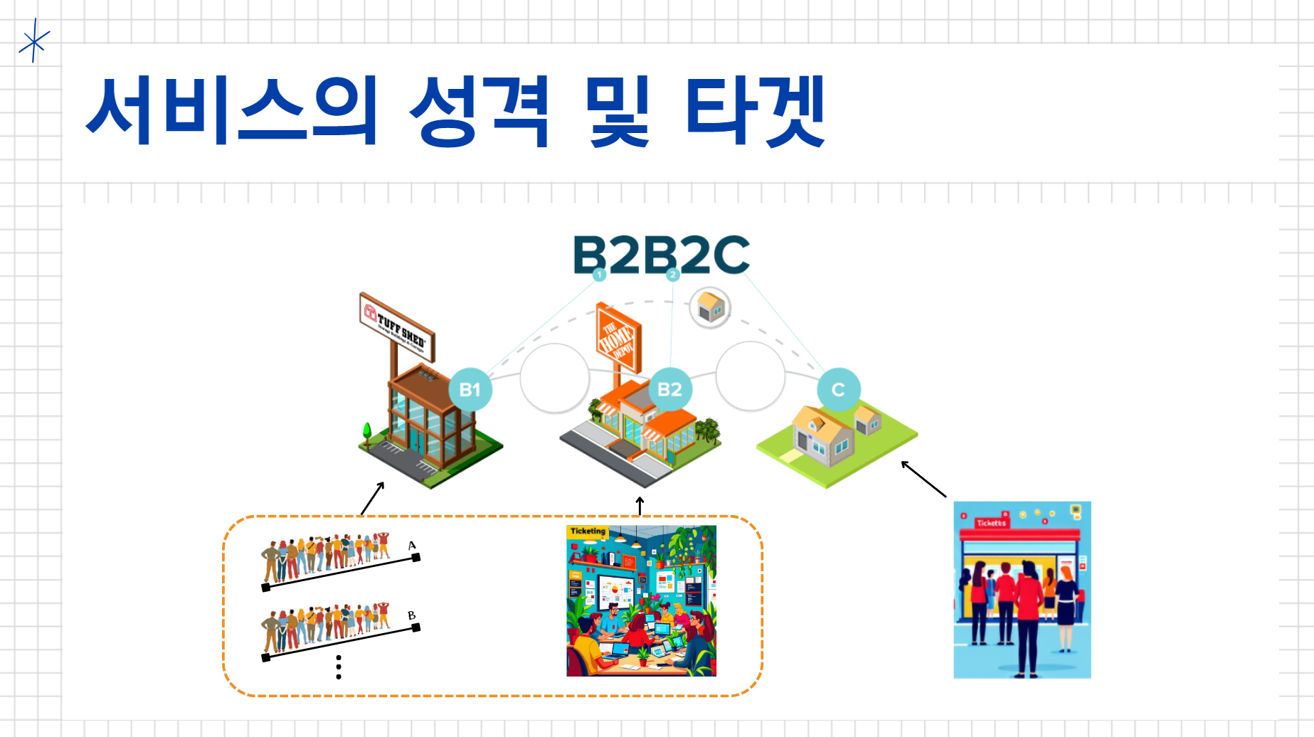 이번 프로젝트에서 기획한 서비스는 B2B2C로, 서비스의 사용자는 대기열 서비스를 원하는 기업의 개발자가 될 것이며, 해당 기업은 엔드포인트 사용자에게 서비스를 제공하는 구조로 이루어져 있다.