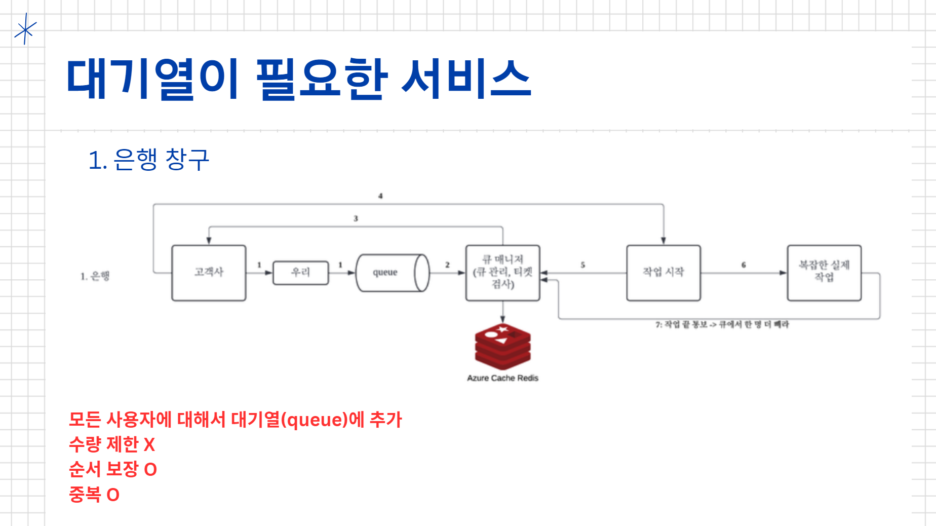 대기열이 필요한 서비스로 크게 2개를 구상했었는데, 처음은 은행창구였다. 방문하는 모든 사용자에 대해 대기열을 세워야 하고, 순서를 보장하고, 중복이 존재해도 된다는 특징을 가지고 있다.