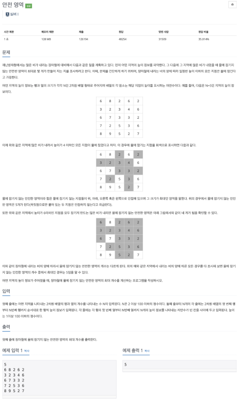 ans = Math.max(ans, solve(h)); // 현재 높이에서의 안전 영역 개수 비교 후 최대값 저장